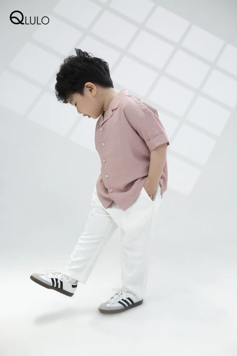Áo sơ mi tay ngắn màu hồng mận cho bé, thiết kế dạng vải linen đi biển.