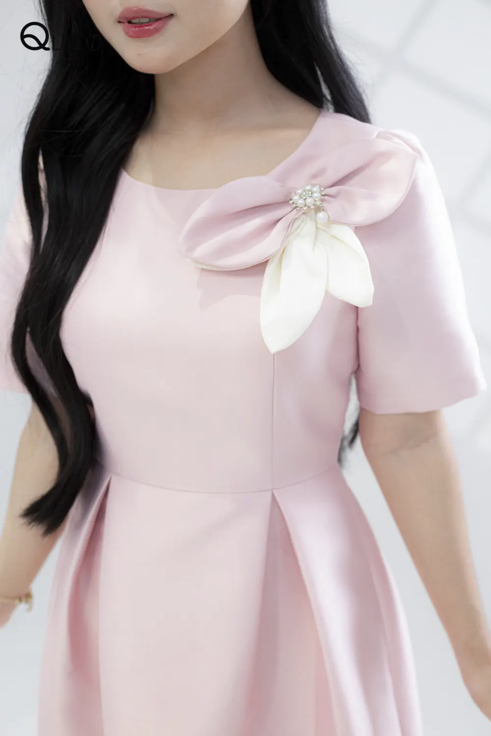 Đầm thiết kế màu Hồng Pastel, có họa tiết hoa hồng cách điệu màu trắng và hồng ngay cổ áo