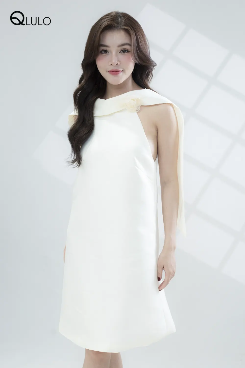 Đầm thiết kế màu trắng kem, có họa tiết hoa hồng cách điệu màu trắng và hồng ngay cổ áo